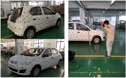 流程: 以下圖掃描整車為例,首先,為整車布點,并用全局攝影測量系統獲取標記點的空間三維數據。